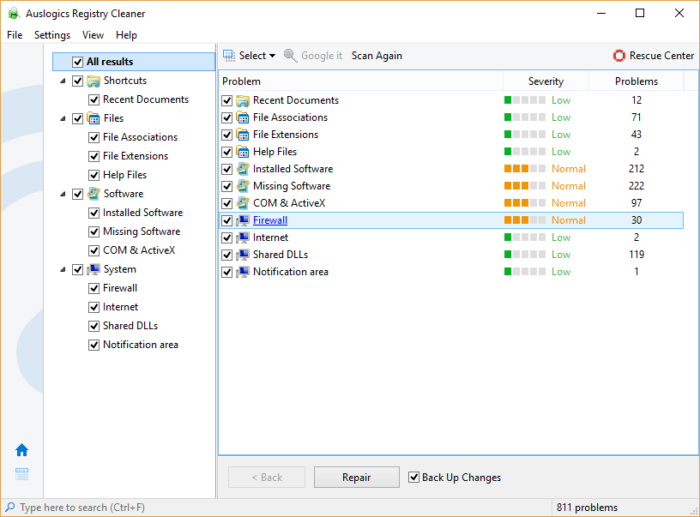 It now scans your Registry for errors, then shows you what it found. It ranks the errors according to their severity, to help you decide which to fix. Click Repair when you’ve made your decision, and make sure that “Back up Changes” is checked, so you can restore the Registry easily if something goes wrong.
