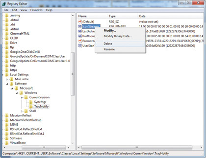 Browse to HKEY_CURRENT_USER\ Software\Classes\Local Settings\Software\Microsoft\Windows\ CurrentVersion\TrayNotify, and delete both IconStreams and PastIconsStream values.