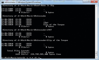 Switch to the folder containing your music using the cd command (for example, cd music cd my documents\my music), then type "attrib -s *.* /d /s" and press [Enter].