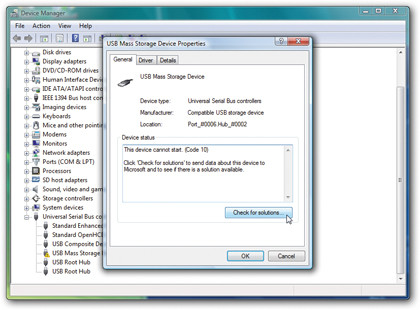 Look on the General tab for an error code and description of the problem – if a troubleshoot button is present, click it to see if you can fi x the problem easily.