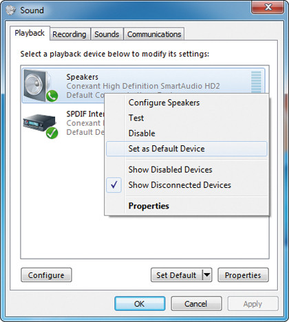 Select the Playback or Audio tab, and verify the device is set to be the default; if not, select it from the list to fix the problem.