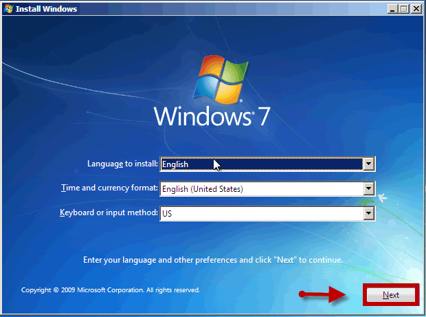 1. Insert the Windows 7 installation DVD and boot from it. Afterwards, select your language and other preferences and click Next to continue.