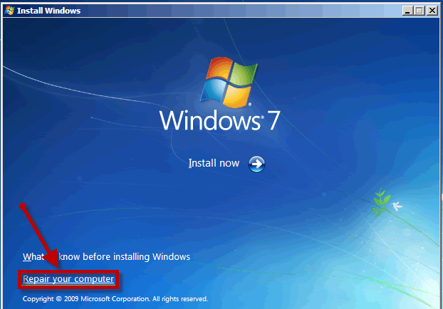 2. Click the Repair your computer link on the bottom, shown as below.