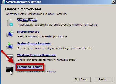 3. Click the Command Prompt link on the System Recovery Options window.